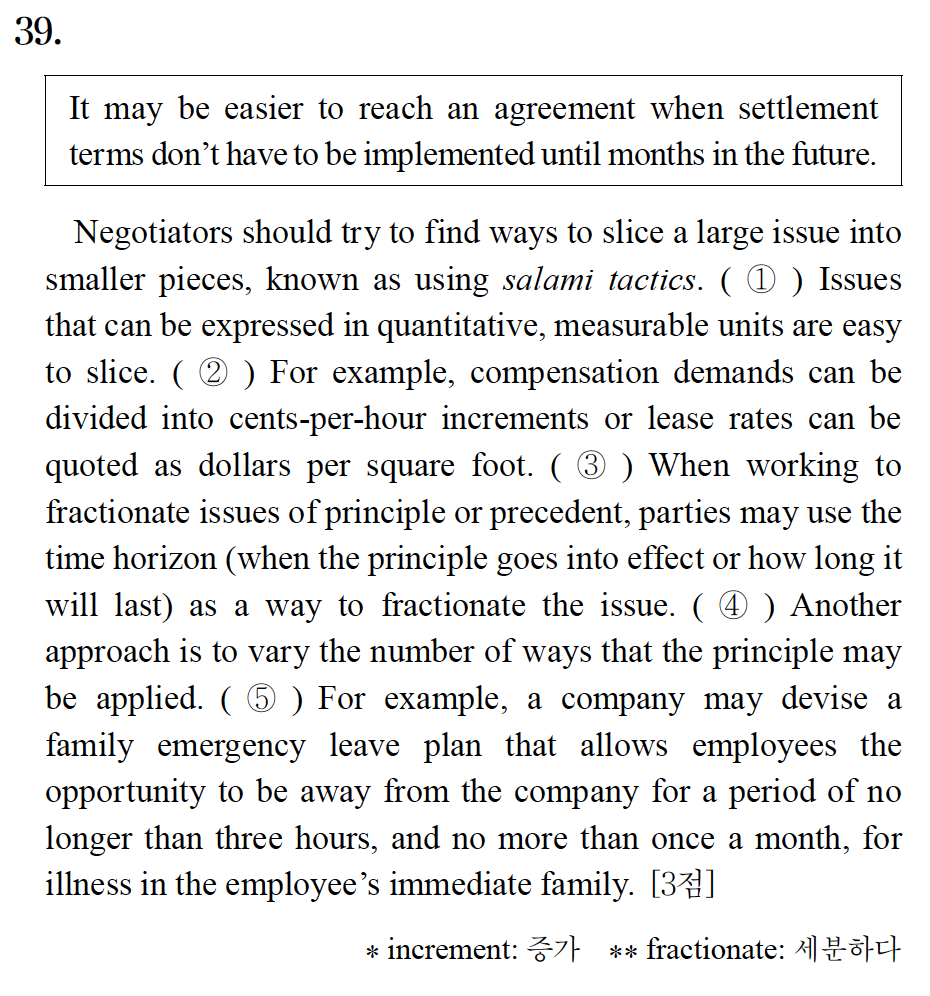 협상자들은 큰 문제를 작은 부분으로 나누는 방법을 찾아야 하며, 이를 "쌀라미 전술"이라고도 합니다.